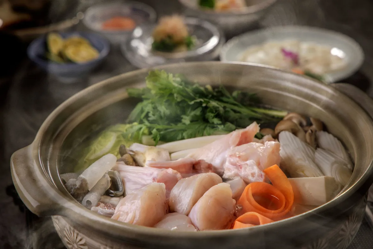 「舞」では、全4種類の鍋料理を提供します。これらは、体が温まるだけでなく、個々の食材が持つ味わいを引き立てるよう工夫されています。特におすすめは「ふぐ鍋コース」。ぷりぷりとしたふぐの身をふぐ刺しやふぐちりとして堪能し、さらに季節の野菜と共に特製のだしで楽しむ一品です。その締めには、ふぐの旨味がたっぷりと詰まった雑炊かうどんが用意されています。