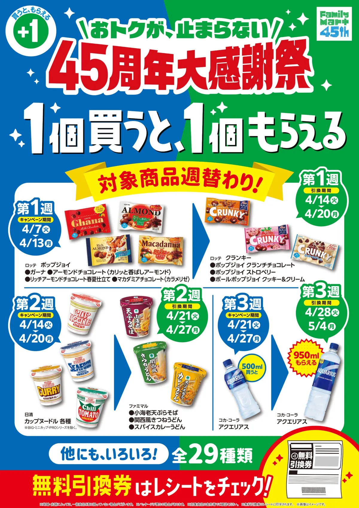 今回の大感謝祭は、2026年4月7日から4月27日までの期間、毎週異なる対象商品で「1個買うと、1個もらえる」キャンペーンを実施します。このキャンペーンでは、人気の商品を多数揃え、特に過去のキャンペーンで高い引換率を誇っていた「アクエリアス500mlを買うともらえる950ml」が再登場します。