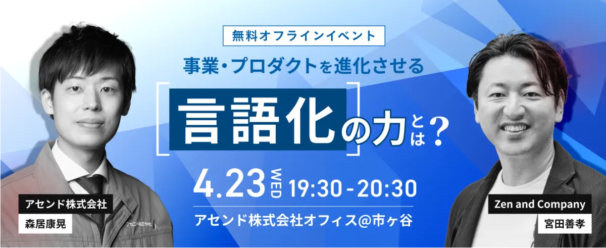 現代のビジネスにおいて、「言語化」は事業戦略を立案し、組織文化を形成するために重要な要素です。特にBtoB分野、及び特定業界に特化したVertical SaaSでは、複雑な業務や課題に取り組む必要があるため、言語化の重要度は増しています。アセンドの取締役CPOである森居康晃氏が、宮田氏と共に、事業や商品作りに関する「言語化」の機能やその実施方法を探ります。