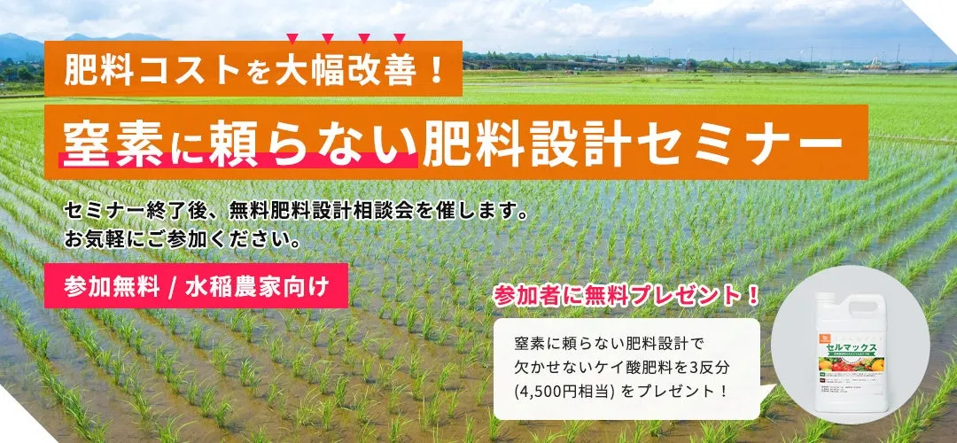 参加者全員には窒素過多を防ぎ、作物の品質向上に必須の「ケイ酸肥料(3反分・4500円相当)」をプレゼントします。これにより、新たな収穫の可能性を広げることができることでしょう。