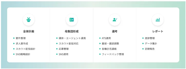 このサービスは、エンジニア採用の要件定義から技術広報、スカウト送信、日程調整、エージェント管理などを含む、事務代行にとどまらない包括的なサポートを提供します。企業のニーズに合わせ、採用プロセスの各段階をスムーズに展開することが可能です。