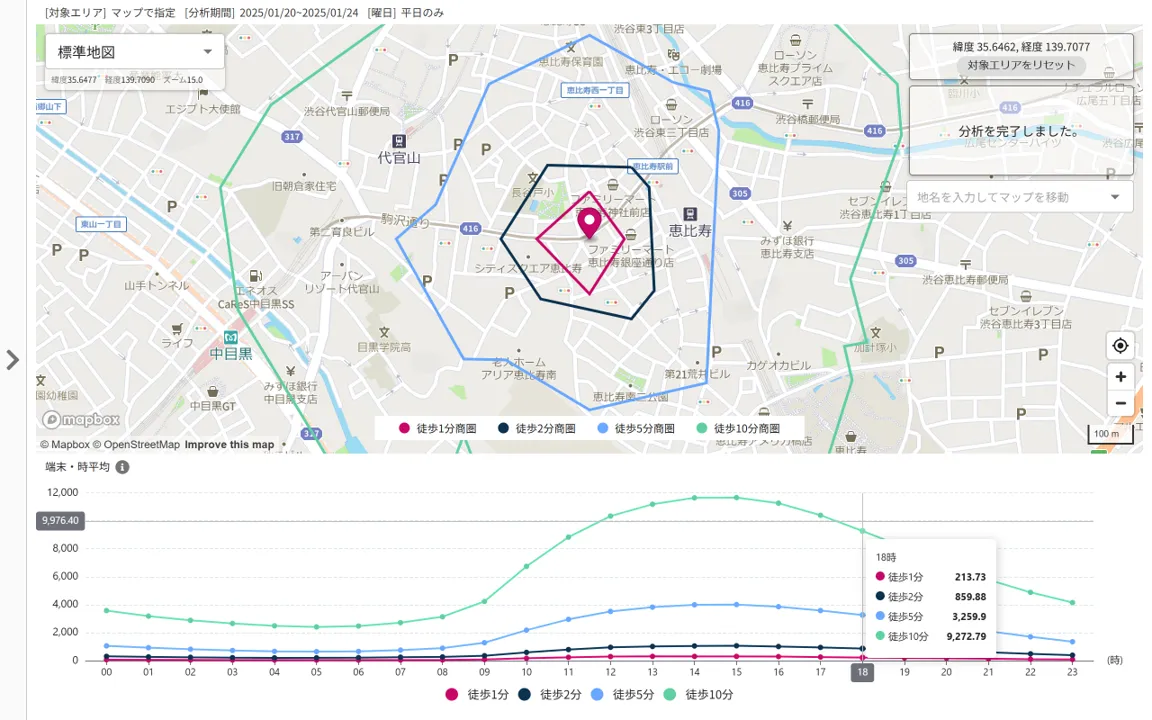 たとえば、徒歩1分、2分、5分、10分の商圏における人々の滞在状況を、時間帯ごとにグラフで確認できるため、店舗の立地選定や販促戦略の策定がスムーズに行えます。また、新機能は【バードアイ人流】の一部として利用でき、これによりエリアの混雑具合や通行量を同時に把握することができます。