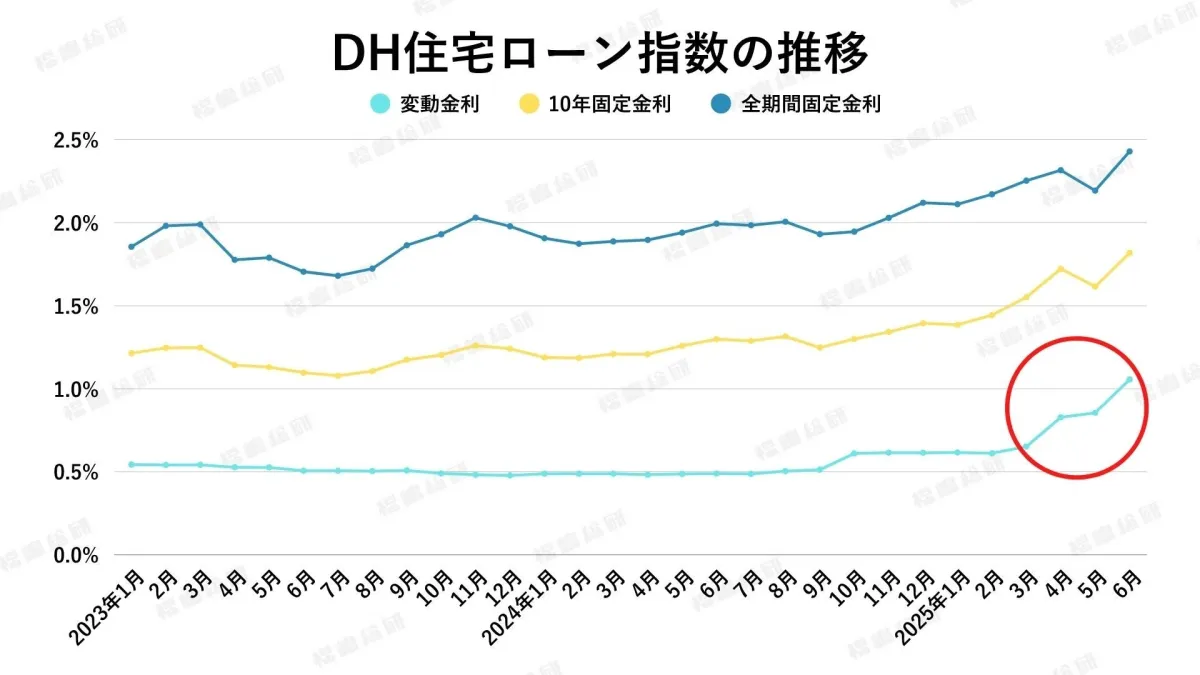 2025年6月1日の時点で、変動金利は1.056%と先月から大幅に上昇しましたが、これは優遇制度の変更による影響が大きいとされています。各銀行は慎重な姿勢を崩さず、金利の据え置きを続けており、新たな大きな変化は見られませんでした。