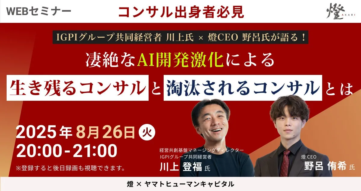 2025年8月26日、ヤマトヒューマンキャピタル株式会社が主催するウェビナー『凄絶なAI開発激化による生き残るコンサルと淘汰されるコンサルとは』に注目が集まっています。このセミナーでは、燈株式会社のCEOである野呂侑希氏と、株式会社経営共創基盤のマネージングディレクター・IGPIグループ共同経営者である川上登福氏が、最新のAI業界の動きについて深く掘り下げます。
