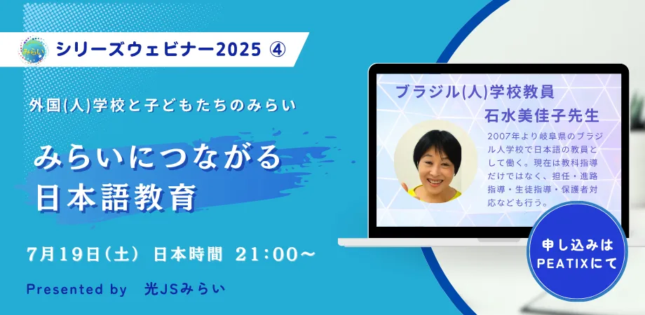 2023年7月19日(土)、光JSみらいウェビナーシリーズ「外国(人)学校と子どもたちのみらい」の最終回が開催されます。このウェビナーは、全4回を通じて日本の外国人学校と、そこで学ぶ子どもたちの現状と未来を深掘りしてきたものです。