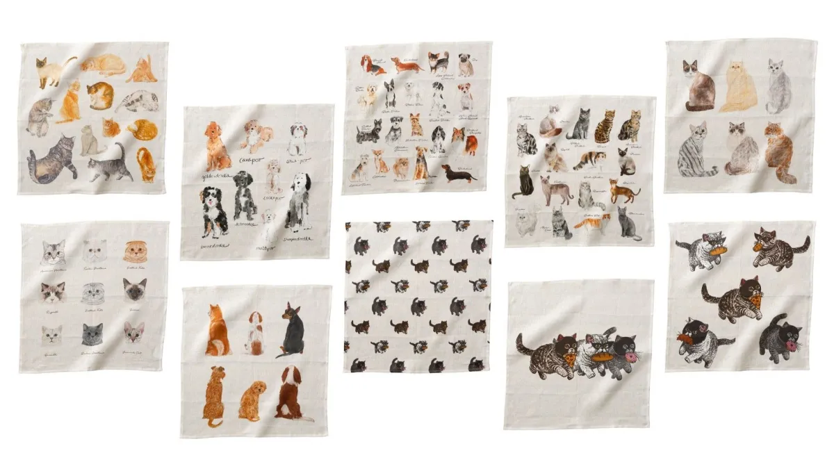 新作ハンカチは、約43cm四方のビッグサイズで、肌触りの良いリネン生地を使用しています。吸水性や速乾性に優れ、特にこれからの季節にぴったり。10種類のアニマルデザインが揃い、猫や犬それぞれの個性が際立っています。