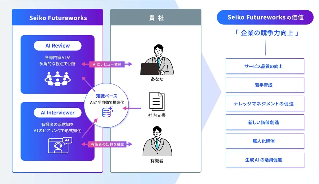 Seiko Futureworksは、企業ルールやナレッジを安全に反映できる生成AIプラットフォームで、AIインタビュアーだけでなく、AIレビュワーや円卓会議機能も備えています。これにより、業務プロセス全体での知識の取得・活用・継承をシームレスに行います。