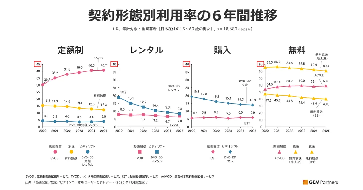 GEM Partners株式会社は、映像コンテンツの利用実態に関する分析レポート「動画配信/放送/ビデオソフト市場 ユーザー分析レポート」の2025年版を発表しました。このレポートでは、定額制(SVOD)、レンタル(TVOD)、購入、無料サービスの契約形態に基づいて、視聴実態の変化と利用動向を詳細に分析しています。
