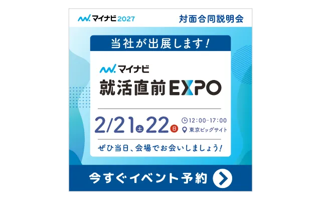 「マイナビ就活直前EXPO」は2026年2月21日(土)と22日(日)12時から17時まで、東京都江東区の東京ビッグサイトで開催されます。事前の参加予約は公式サイトから可能です。