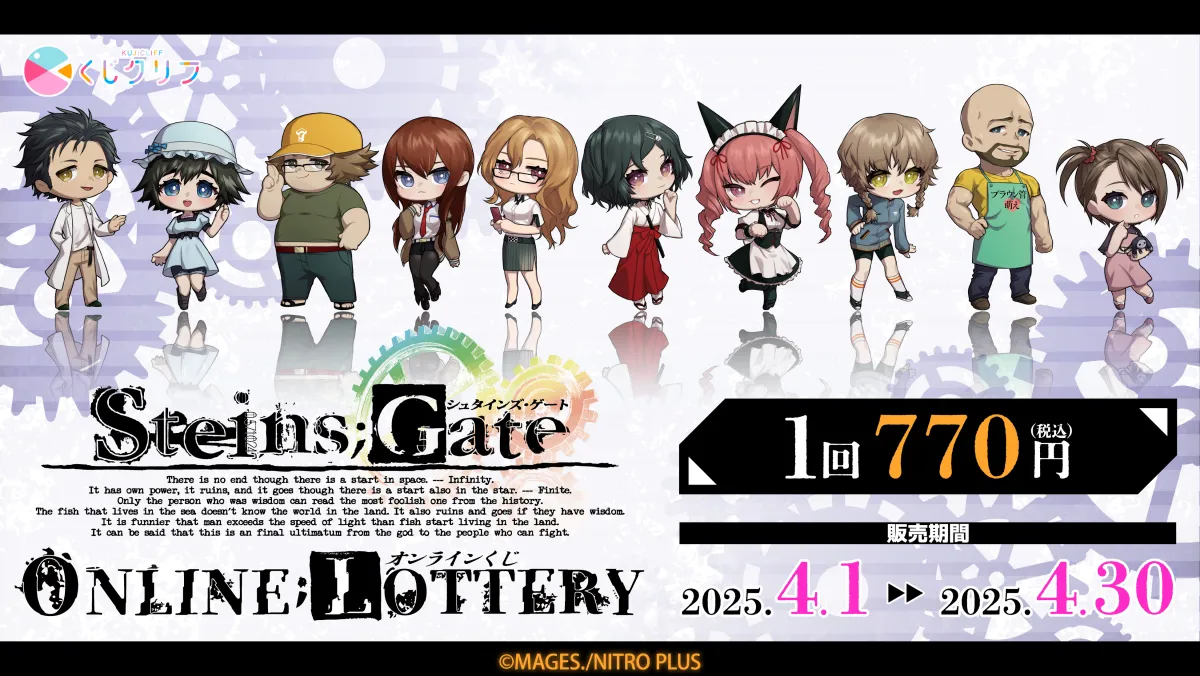 『STEINS;GATE』ファンに朗報です!株式会社サトクリフが運営するオンラインくじサービス「くじクリフ」にて、人気ゲーム『STEINS;GATE』のオンラインくじが2025年4月1日から発売されます。このオンラインくじでは、ゲーム内に登場するビジュアルを元にしたイラストや、くじクリフオリジナルの描き下ろしイラストを使用した豪華な商品が揃っています。