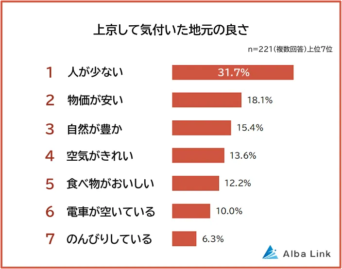 株式会社AlbaLinkが行った調査によると、上京した地方出身者が実感した地元の魅力が明らかになりました。対象は東京で仕事または居住している地方出身者221人。調査の結果、1位には「人が少ない」という回答が寄せられました。東京生活で感じる混雑や忙しさの中で、地方の「人の少なさ」が際立っていることが分かります。
