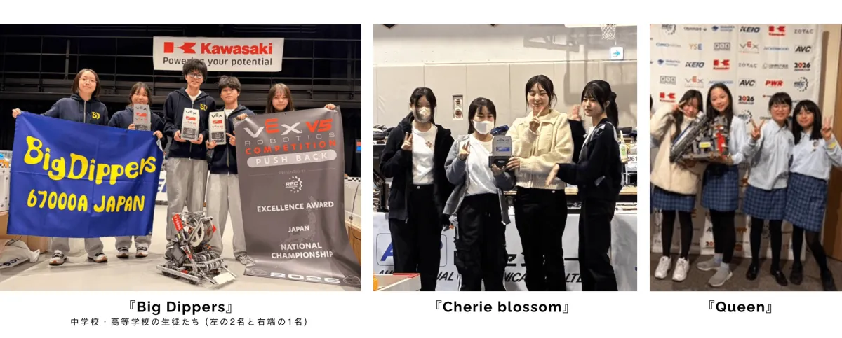 - このチームは、1月に開催された「Japan V5RC HS National Regional Championship」で、Excellence Award、Tournament Champions、Robot Skills Championの三冠を受賞しました。