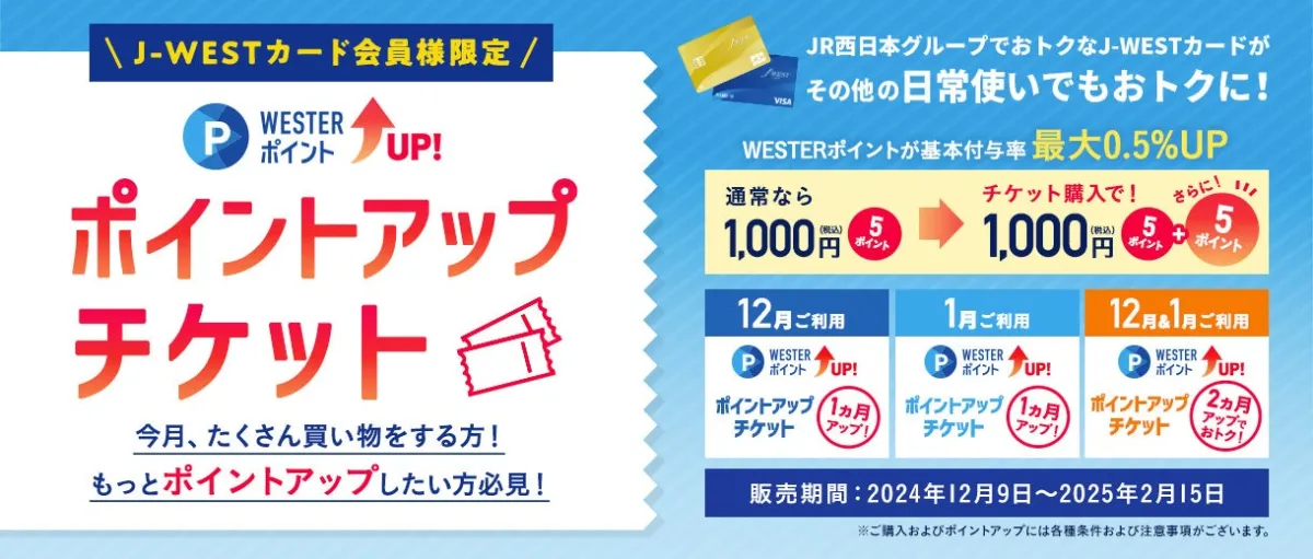JR西日本の「J-WESTカード」を使い、お得なキャンペーンに参加しませんか?現在、会員様限定の「J-WESTカードポイントアップチケット」が登場しました。このチケットを利用すれば、通常のポイントに加えてさらに0.5%分のWesterポイントを貯めることができます。利用期間は2024年12月16日から2025年2月15日までの期間限定です。
