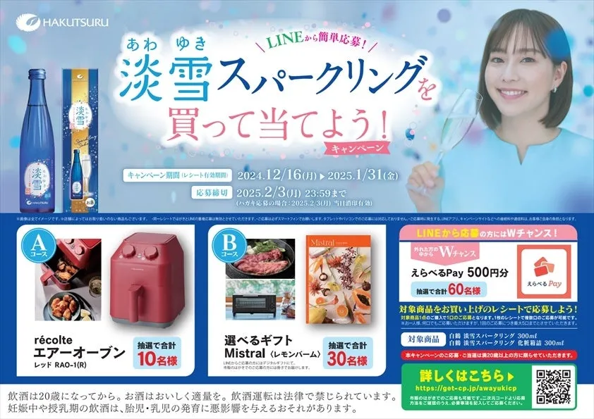 白鶴酒造株式会社は、2024年12月16日から「白鶴 淡雪スパークリングを買って当てよう!キャンペーン」を実施します。このキャンペーンでは、白鶴の人気スパークリング、淡雪スパークリング 300mlを購入することで、豪華賞品を獲得するチャンスがあります。