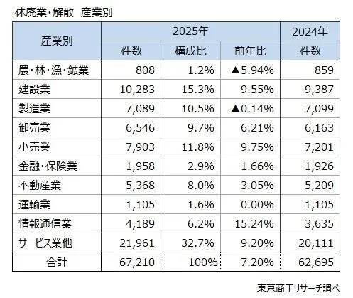 近年、企業の休廃業・解散が増加傾向にあり、2025年にはその数が67,210件に達し、前年比7.2%の増加を示しました。この結果、過去最多を更新することが確実視されています。特に、2021年のコロナ禍を契機に企業の退出が加速している様子が伺えます。これに伴い、2025年の企業倒産は1万件を超える見通しで、休廃業・解散と合わせた企業の退出数は77,000件を超える予測です。