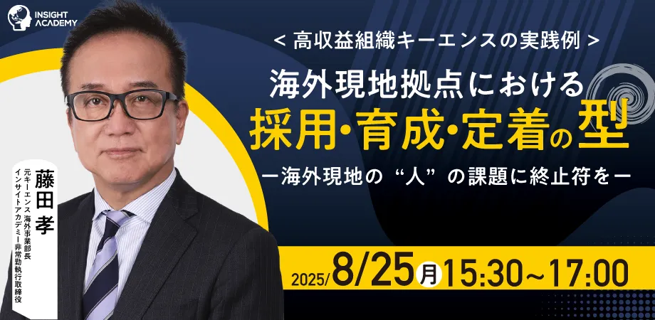 インサイトアカデミー株式会社が主催する無料ウェブセミナー「高収益組織キーエンスの実践例」では、海外現地拠点での採用、育成、定着に関するアイデアとノウハウを学ぶことが可能です。開催日は2025年8月25日、時間は15:30から17:00までの約90分間、オンラインでの実施となります。対象者は企業の人事部門や海外事業部門の責任者や担当者、さらに海外駐在員や駐在予定者と幅広く、参加は無料ですが、申込は法人対象で事前に要件があります。