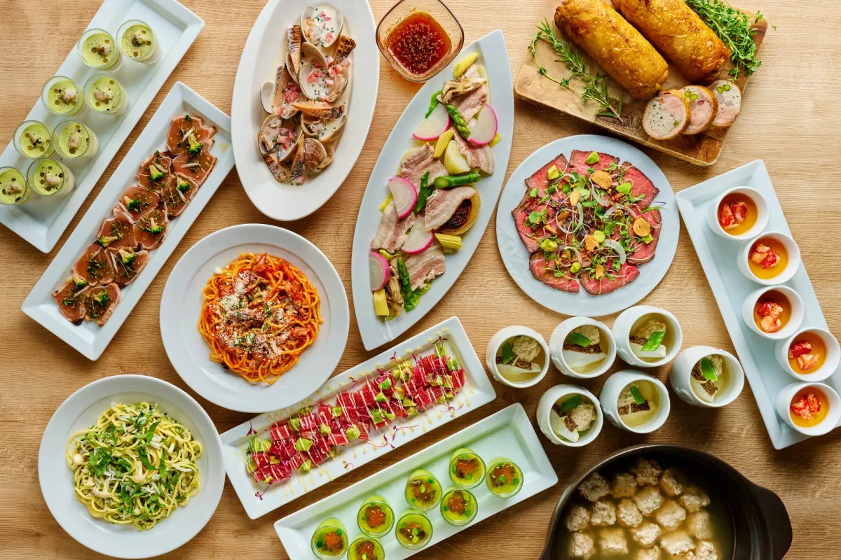 ランチでは「ブラックお好み焼き フォアグラ添え」や「串カツ3種」が勢揃いし、ディナーでは「牛ロース肉の鉄板焼」が用意されます。特にライブキッチンで調理される出来立てメニューは、見た目にも華やかで、味覚を存分に刺激してくれることでしょう。また、季節の食材をふんだんに使用したシェフお勧めの料理も豊富に取り揃えられています。