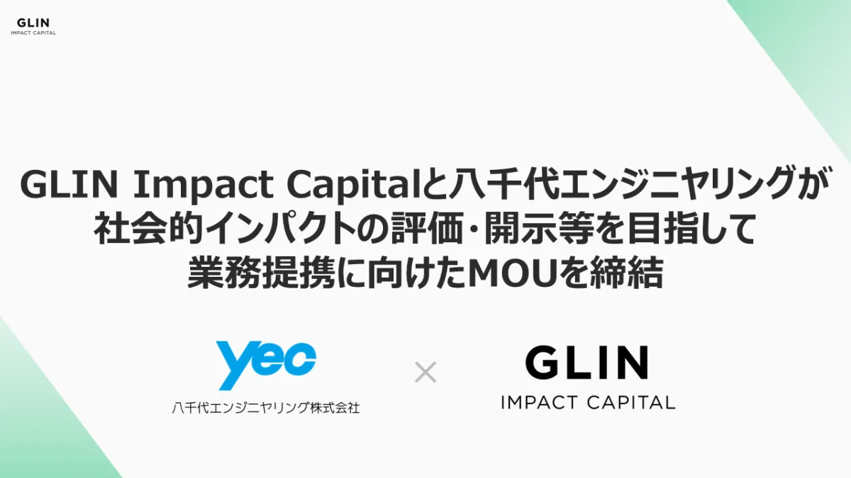 GLIN Impact Capital合同会社(以下「GLIN」と称する)と八千代エンジニヤリング株式会社(以下「八千代エンジニヤリング」と称する)は、社会的インパクトの評価や開示を目指して業務提携を締結しました。この提携は、両社が持つ知識と経験を結集し、投資を通じて社会問題の解決に向けた可視化と定量化を行うことを目的としています。