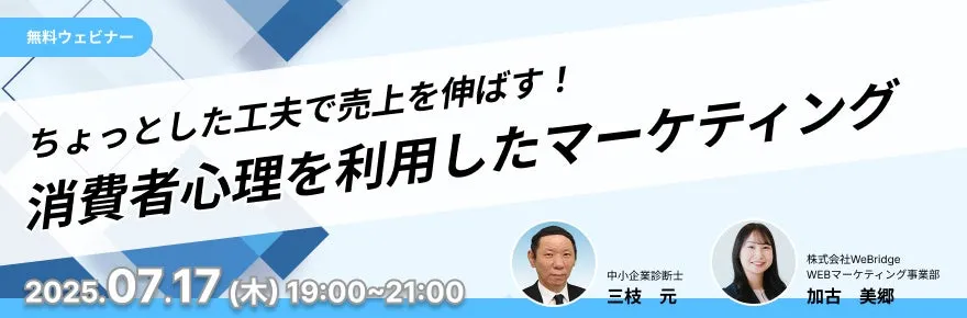 2025年7月17日、業種を問わず経営者やマーケティング担当者向けの無料ウェビナーが開催されます。このセミナーでは、消費者心理を利用したマーケティング戦略を学ぶことができます。参加者は、商品やサービスをより高い価格で販売したり、来店数や購入数を増やしたりする方法を理解することで、集客力の向上を図ることができます。