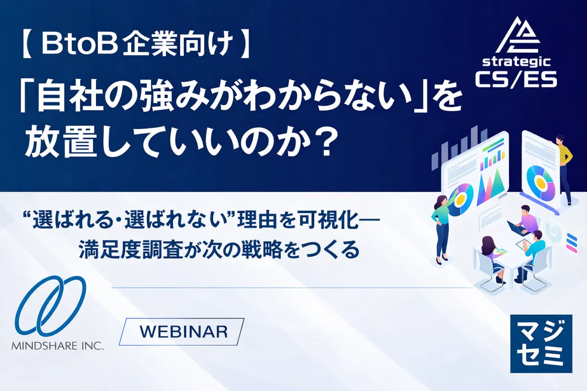株式会社マインドシェア(本社:東京都港区)は、BtoB企業の経営者や担当者向けに、特別なオンラインセミナーを開催しました。このセミナーでは、「自社の強みがわからないを放置していいのか?選ばれる・選ばれない理由を可視化」というテーマのもと、満足度調査が企業戦略にどのように生かされるかを深く掘り下げました。