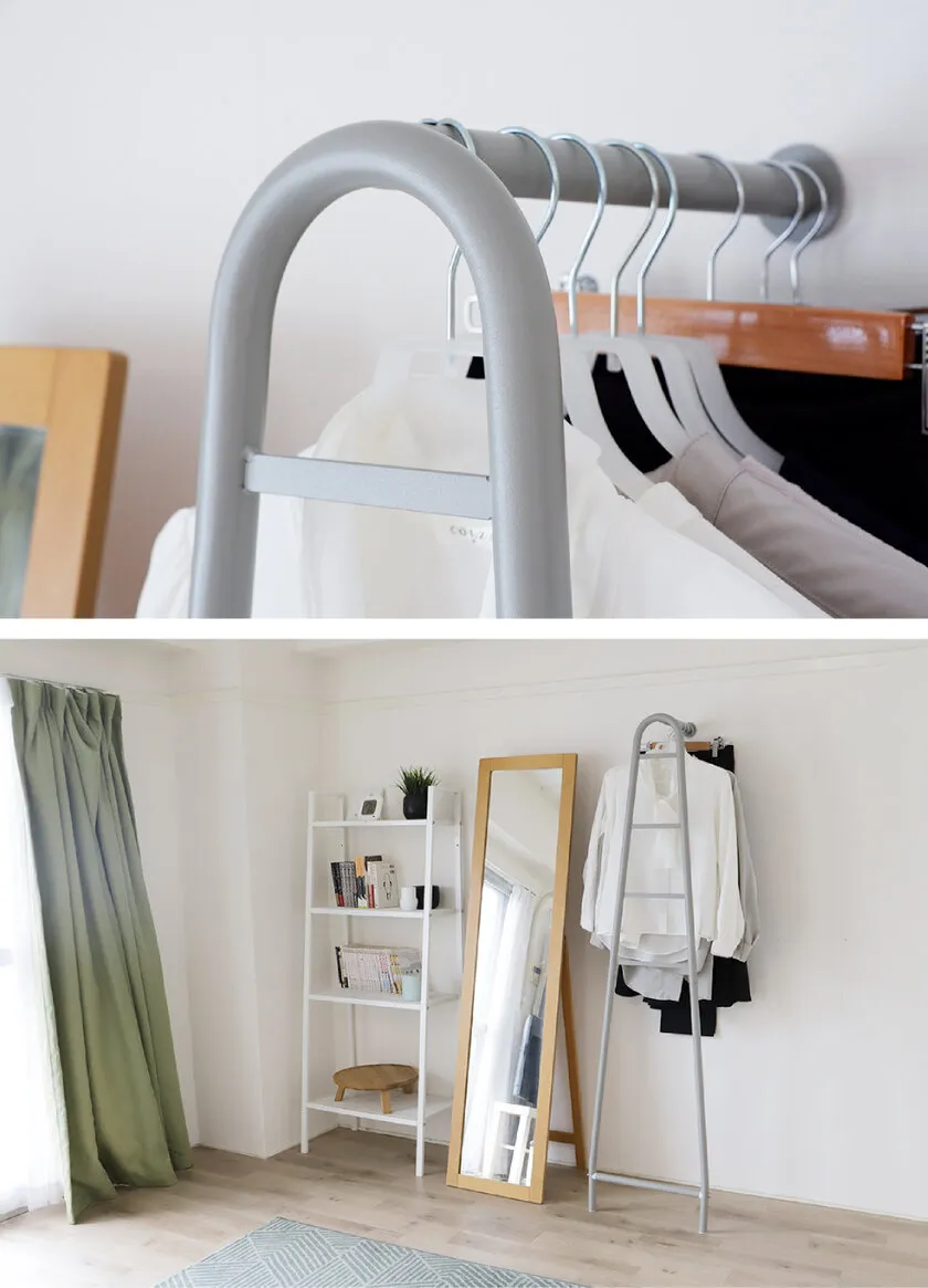 このハンガーラックは、フリマアプリで不用品を出品する際に、商品撮影を簡単に美しく行えるように設計されています。正面に設置されたバーは、ハンガーをかけることができ、床に置いたりドアに掛けたりする必要がなく、安定した状態で撮影が可能です。また、4本のバーがあるので、トップスとボトムスを同時に撮影することもできます。