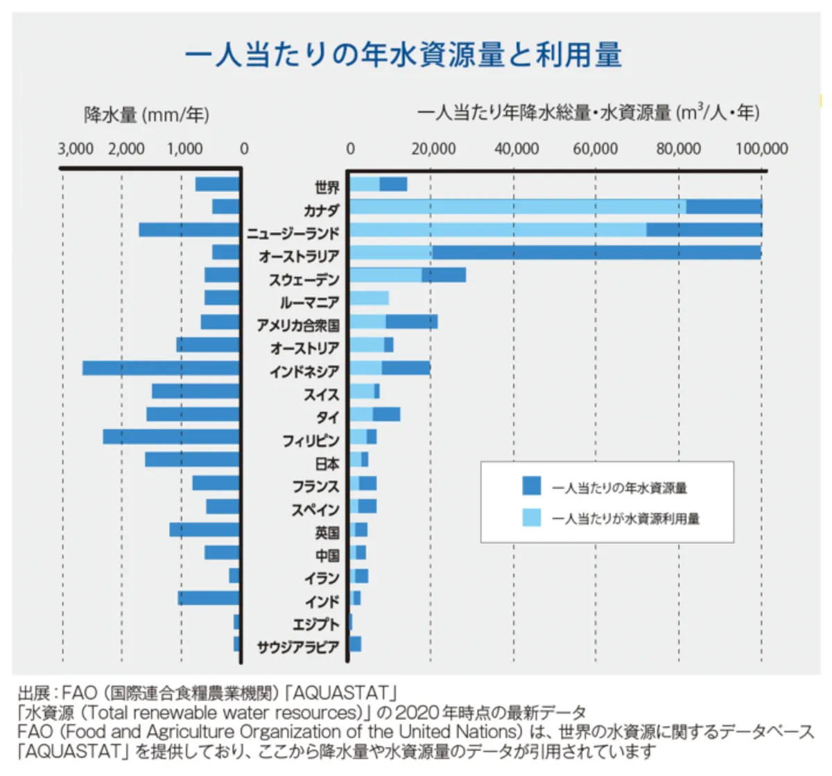 国連開発計画(UNDP)の「人間開発報告書」では、世界中の水資源の分配に格差があることが報告されています。そのため、オーストラリアのように水が豊富な地域もあれば、日本のように水資源量が不足する地域もあります。また、日本は一見水に恵まれている国のように思われますが、実際には近年の気候変動の影響で、雨や雪が減少し、水不足が頻繁に起こっています。特に急激な河川が多く、地震や豪雨といった災害も増えている日本において、水の安定した供給は大きな課題です。