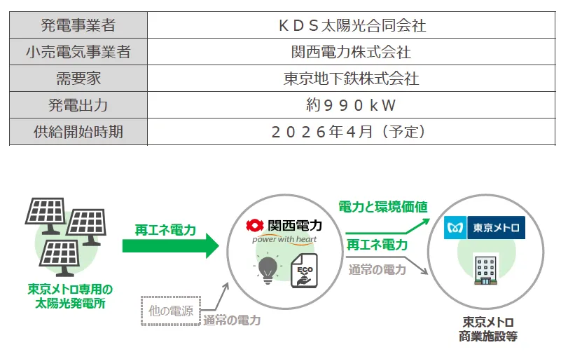 フィジカルPPAとは、需要家が自社の敷地外に設置された再生可能エネルギー発電設備からの電力を購入する仕組みです。今回、KDS太陽光合同会社が開発・運営する約990kWの太陽光発電設備が使用される予定です。2026年4月からは、関西電力が東京メトロの15箇所の商業施設に向けて、再生可能エネルギー由来の電力を供給し、環境価値も提供することになります。これにより、年間約798トンのCO2削減が見込まれています。