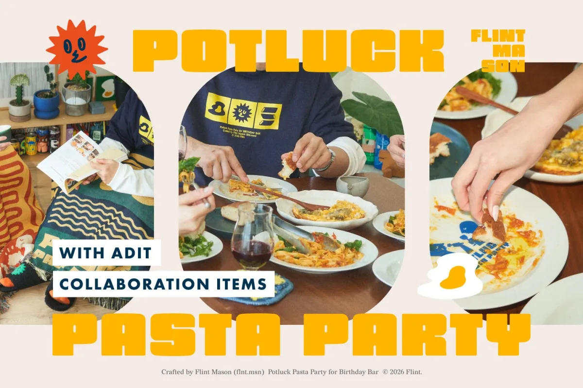 今回のコラボのテーマは「POTLUCK PASTA PARTY」。POTLUCKとは、友人同士がそれぞれ料理を持ち寄り、皆で楽しむスタイルのパーティーを指します。Flint Masonは、このコンセプトを基に、賑やかな食卓を囲む様子を独自のイラストで表現しました。これにより、日常の中でもパーティー気分を楽しめるアイテムが誕生しています。