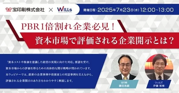 2025年7月23日、水曜の12時から13時にオンラインウェビナー「PBR1倍割れ企業必見!資本市場で評価される企業開示とは?」が開催されます。このイベントは、東京証券取引所からの要請を受けた企業開示の強化や資本政策の重要性を理解するための貴重な機会となります。