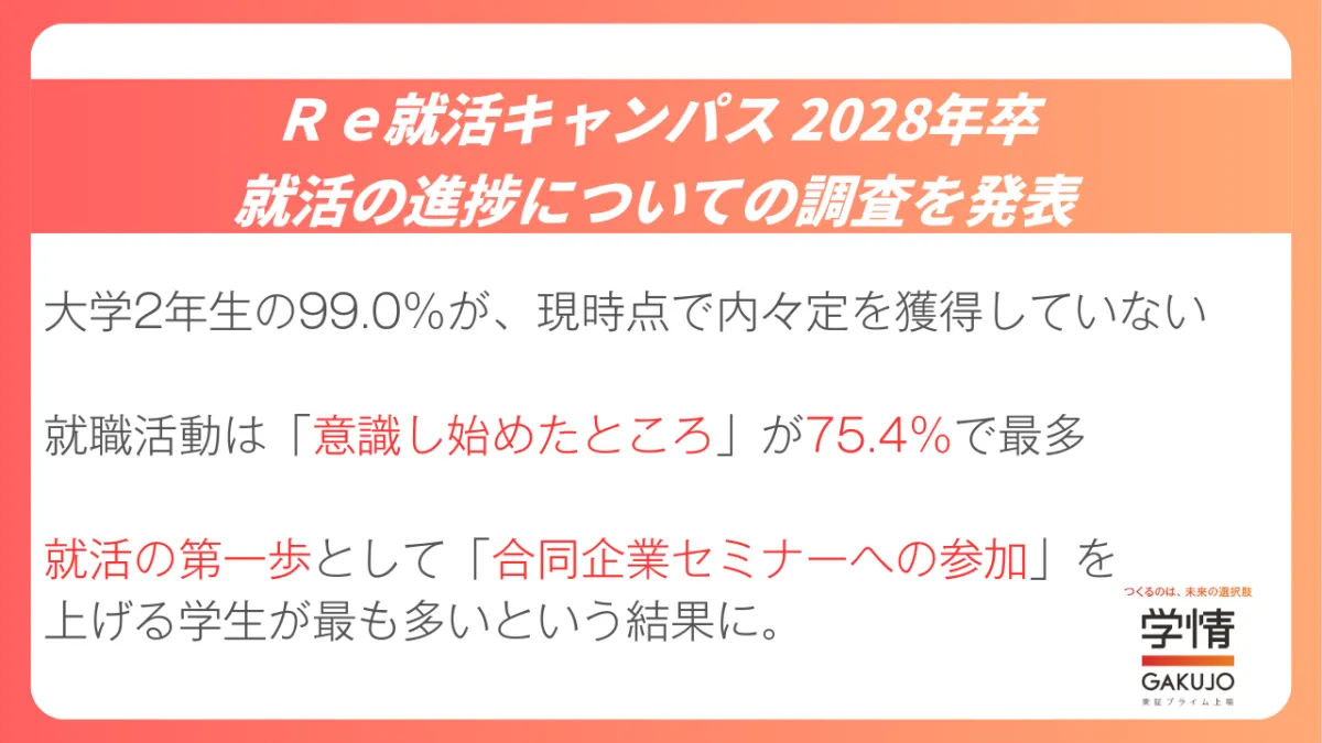 この調査は2028年に卒業予定の大学2年生を対象にしており、進捗状況や意識の変化を明らかにする目的で行われました。結果として、99%の学生が内々定をまだ獲得していないと回答し、多くが今後の活動に向けて準備中であることが確認されました。これは、まだ具体的な志望業界や企業を決めている学生が少ないことも関連しています。