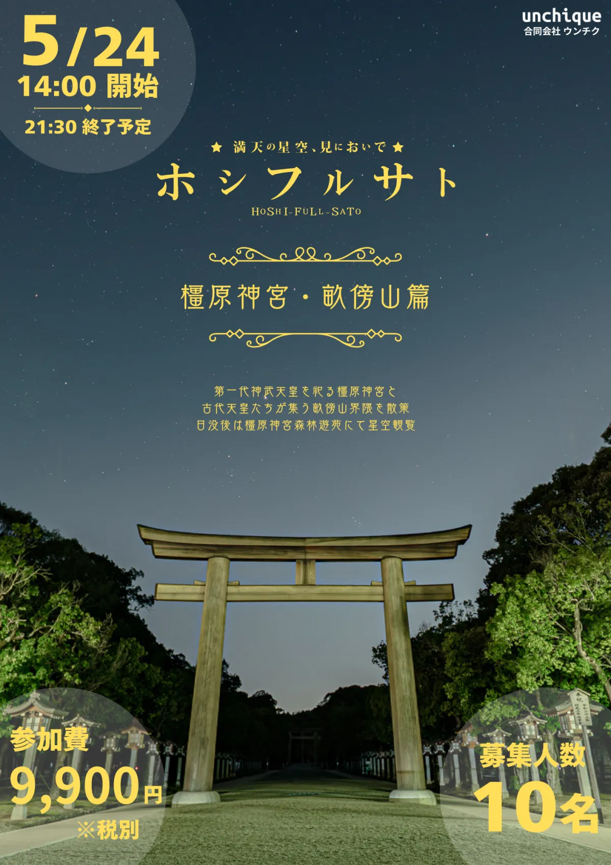 奈良県には日本の歴史が感じられる場所が数多く存在しますが、その中でも特に魅力的なエリアである橿原市。そこで、合同会社ウンチクが企画した新たなアストロツーリズムイベント「ホシフルサトー橿原神宮・畝傍山篇」が、2025年5月24日(土)に開催されることが決まりました。このイベントは、歴史的な場所での星空観賞と散策を通じて、皆さんに特別な体験を提供します。