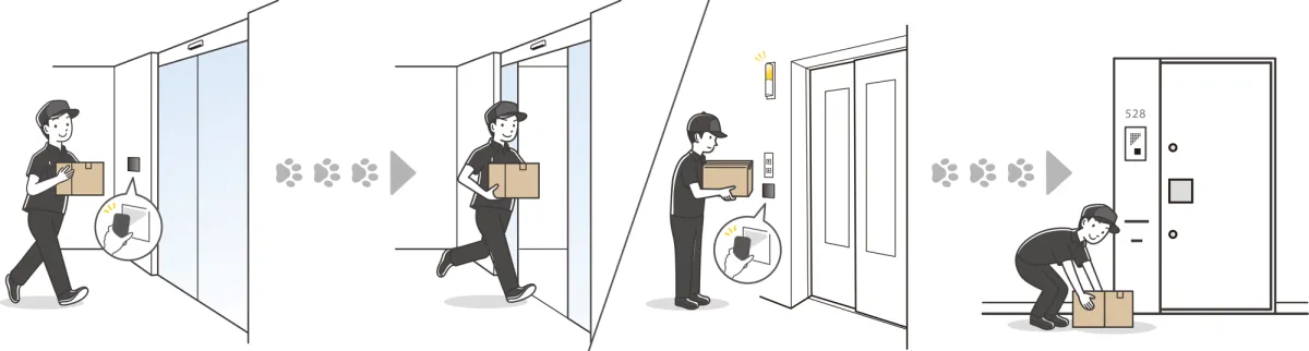 配達員は、共用部を通過して居住者の玄関前まで荷物を届け、配達完了後にはその様子を写真に収めてステータスを更新します。この一連の流れにより、居住者は不在時でも荷物を玄関前で安全に受け取ることができるのです。