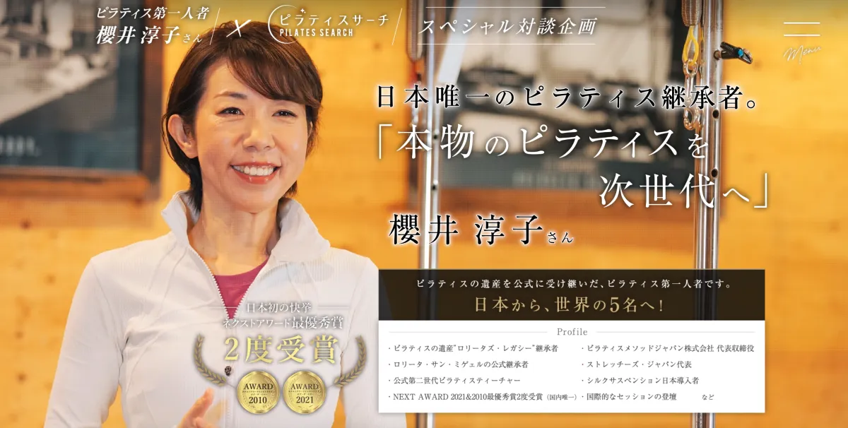 櫻井氏は、ジョセフ・ピラティスの直弟子であるロリータ・サン・ミゲェルからメソッドを継承した日本初の正式継承者です。彼女は、10年以上にわたる指導歴を持ち、東京と静岡でスタジオを運営し、国内外での資格認定やメソッドの継承を行っています。自身の健康問題を通じてピラティスと出会い、その深い価値を体感しに、多くの人々へ伝えることに情熱を注いでいます。