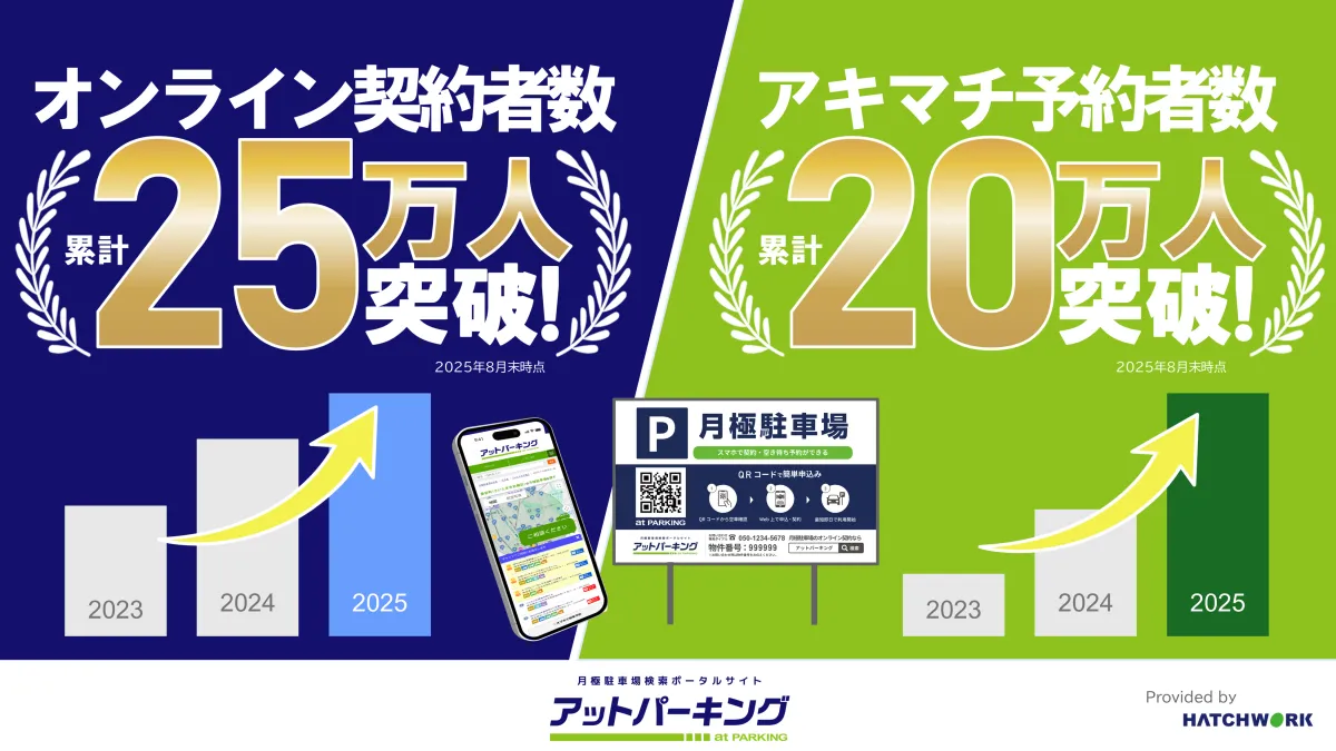 株式会社ハッチ・ワークが運営する月極駐車場検索サイト「アットパーキング」が、オンラインでの月極駐車場契約者数が累計25万人を突破しました。この記録は、2024年10月末に20万人を超えてからわずか10カ月で達成されたもので、急速なサービスの普及を示しています。また、同時に空き待ち予約サービス「アキマチ」の予約者数も20万人を超えるなど、デジタル化の潮流が月極駐車場業界にも波及しています。
