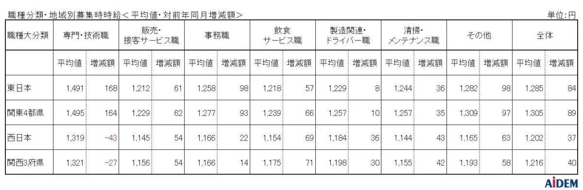 東京都、神奈川県、埼玉県、千葉県などの1都7県を含む東日本エリアの平均時給は1,285円となりました。これは前年同月比で84円の増加です。職種別に見ると、専門・技術職が1,491円で最も高くなっており、次いで事務職が1,258円、清掃・メンテナンス職が1,244円と続いています。全ての職種で前年に比べてプラスの成長を見せています。