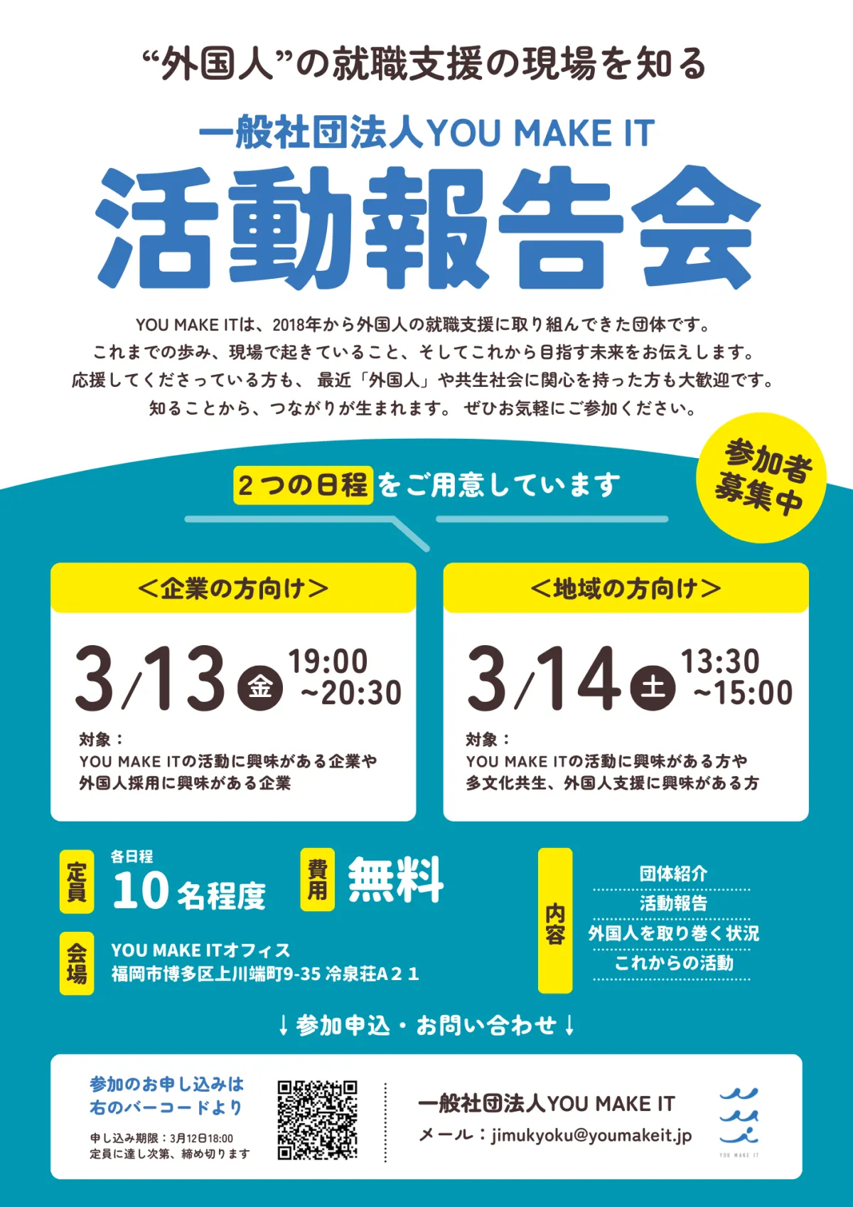 2026年の春、福岡市において一般社団法人YOU MAKE ITが初となる活動報告会を開催します。この報告会は、福岡にて外国人のキャリアや就労支援を行っている同団体のこれまでの取り組みをまとめ、未来への展望を広げるための重要な機会となります。