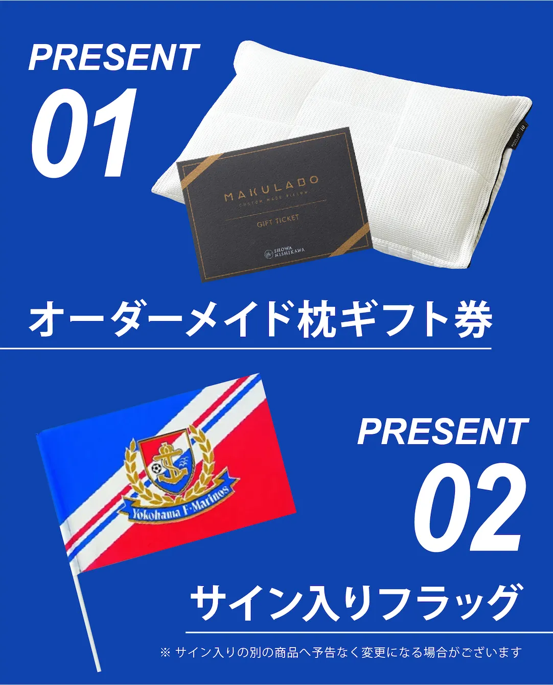 プレゼントには、昭和西川のオーダーメイド枕ギフト券や、横浜F・マリノスの選手直筆サインが入ったフラッグが用意されています。試合によって当選人数や賞品内容は変化していくため、どの試合でも楽しみが広がります。