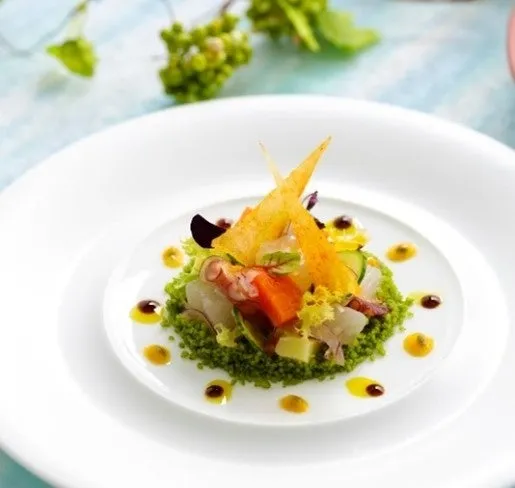 「長崎サマーセレクション」では、長崎の豊かな海が育んだ旬の鱸(すずき)、蛸(たこ)、本金目(ほんきんめ)に加え、対馬地鶏やながさき黄金(島原)、ビーツ(大村)、アスパラガス(壱岐)、ブルーベリー(佐世保)など、地元の特産物がふんだんに使われています。これらの食材は、奇跡のような自然環境で育まれ、味に深みを与えています。