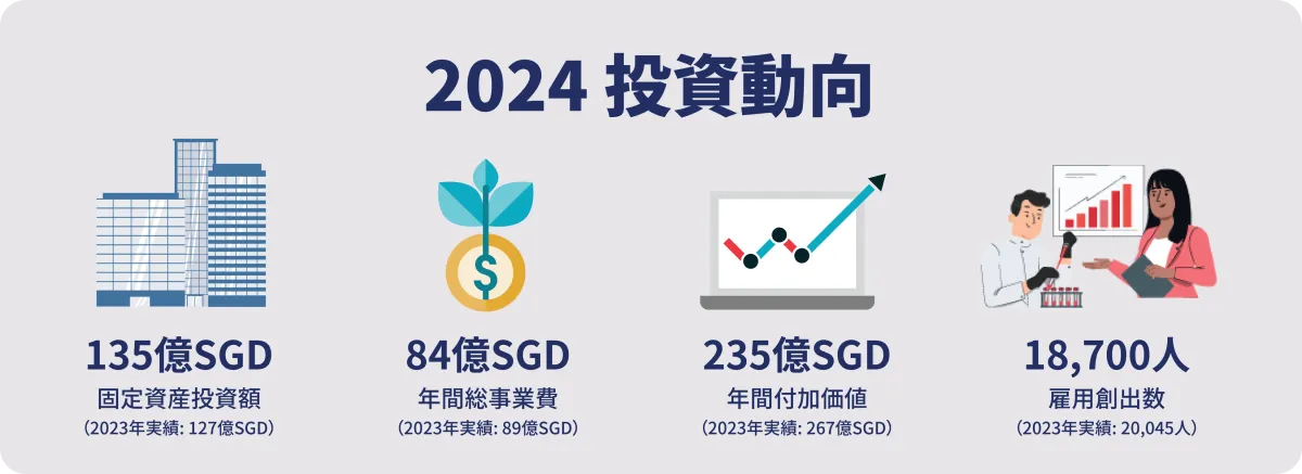 2024年の固定資産投資額は135億SGD(約1兆5,120億円)、そのうち111億SGD(約1兆2,432億円)は製造業に集中しています。特に、半導体とバイオメディカルが大きな役割を果たしています。さらに、医療技術、特殊化学、デジタル領域の製造・サービス産業も含まれ、精密医療やAI、持続可能な製品、サービスなど新たな成長分野が注目を集めています。