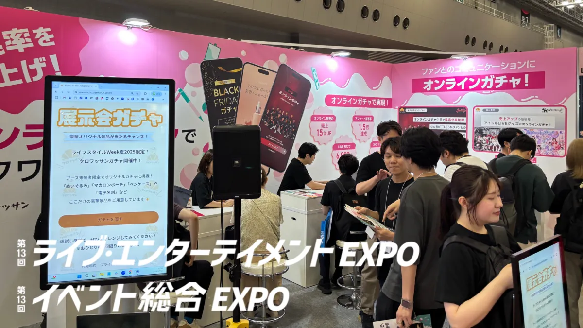 ブースでは実際のライブイベントを想定した「その場体験」を提供します。来場者は、特典付きのガチャを回すことで、物販エリアへの関心を高める仕掛けも用意されています。また、ファンの嗜好を把握するための部門別のアンケートや参加者特典への誘導等、一連の体験を通じて、より多くのファンとつながる機会が創出されます。