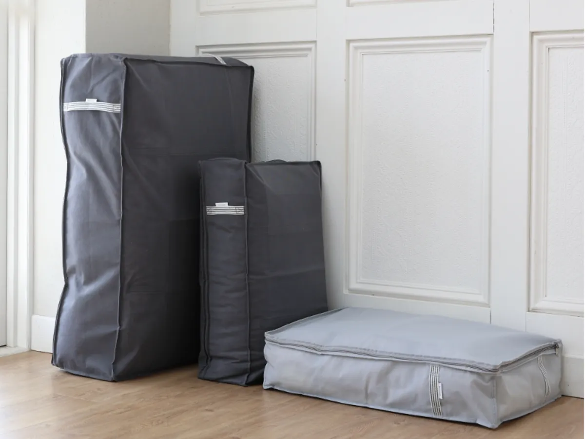 さらに、この布団収納袋のユニークな点は、横置きだけでなく立てて収納できるところです。クローゼットの限られたスペースでも有効に使えるため、ちょっとしたスキマにスリムに収まります。床に置いた時でも、持ち手が両側面に付いているため、取り出しやすく、使い勝手も抜群です。