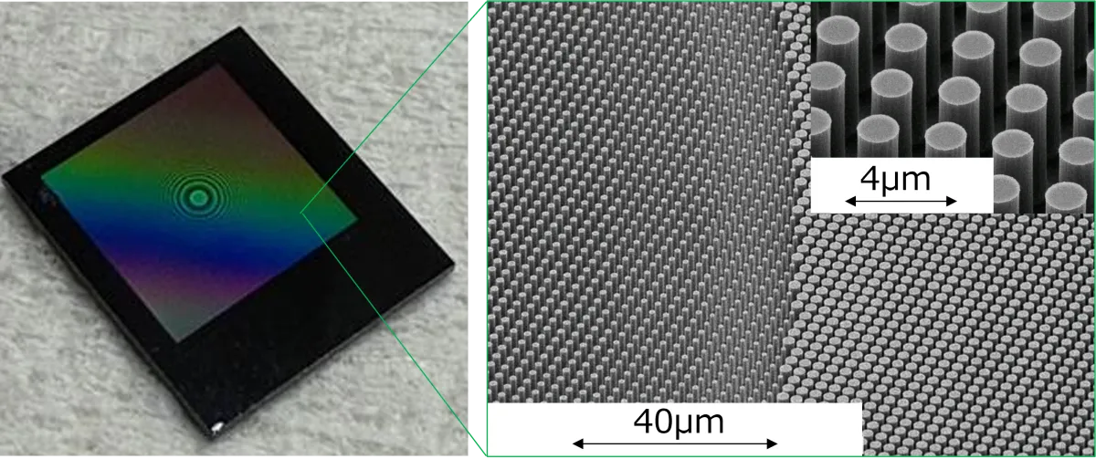 メタレンズは、光学素子の表面に微細構造を形成することで光を制御します。このアプローチにより、従来の光学系では実現できなかった多機能化が可能です。ナルックスは独自の設計技術を用い、これまでの光学特性を確保した上での開発を進めています。