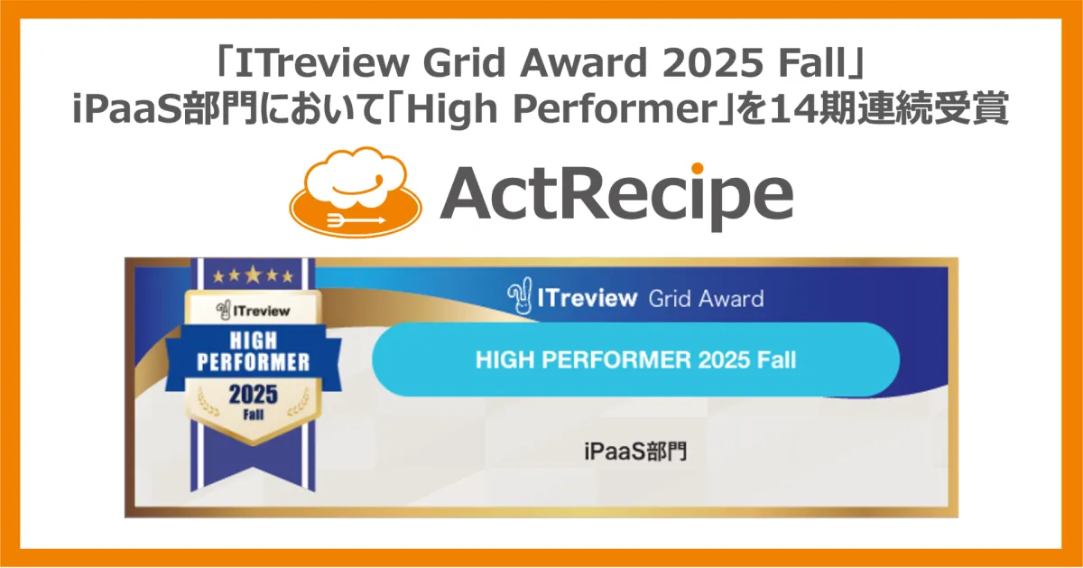 ITreviewは、ユーザーによるレビューをもとにIT製品やクラウドサービスを評価する日本のプラットフォームです。この評価基準に基づく「ITreview Grid Award」は、特に顧客満足度が高い製品を「Leader」や「High Performer」として四半期ごとに表彰します。「ActRecipe」はその中で、「High Performer」に選出され、14期連続での受賞を果たしました。