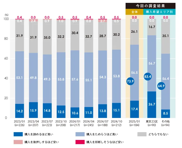 調査結果によると、東京23区のマンション購入検討者の83.4%が現在のマンション価格に対して「高く感じる」と回答。一般の消費者全体でも73.9%がそのように感じていることが明らかになりました。これは、マンション価格が高まったため、購入をためらっている人が多いことを示しています。この結果は、特に都市部における土地の供給限界や建築コスト、人件費の高騰がぎっしり詰まった影響と言えます。