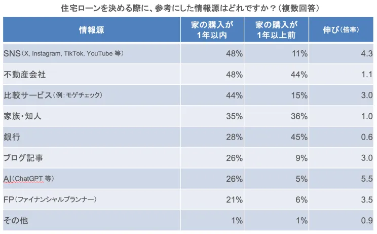 調査によると、住宅ローン決定の際に利用される情報源が変わってきています。特に、SNSや比較サービス、生成AIなどのWebサービスが広く用いられていることが分かりました。特に生成AIの利用が急増し、前年と比べて5.5倍も増加しています。このトレンドは今後も続くと予測されます。