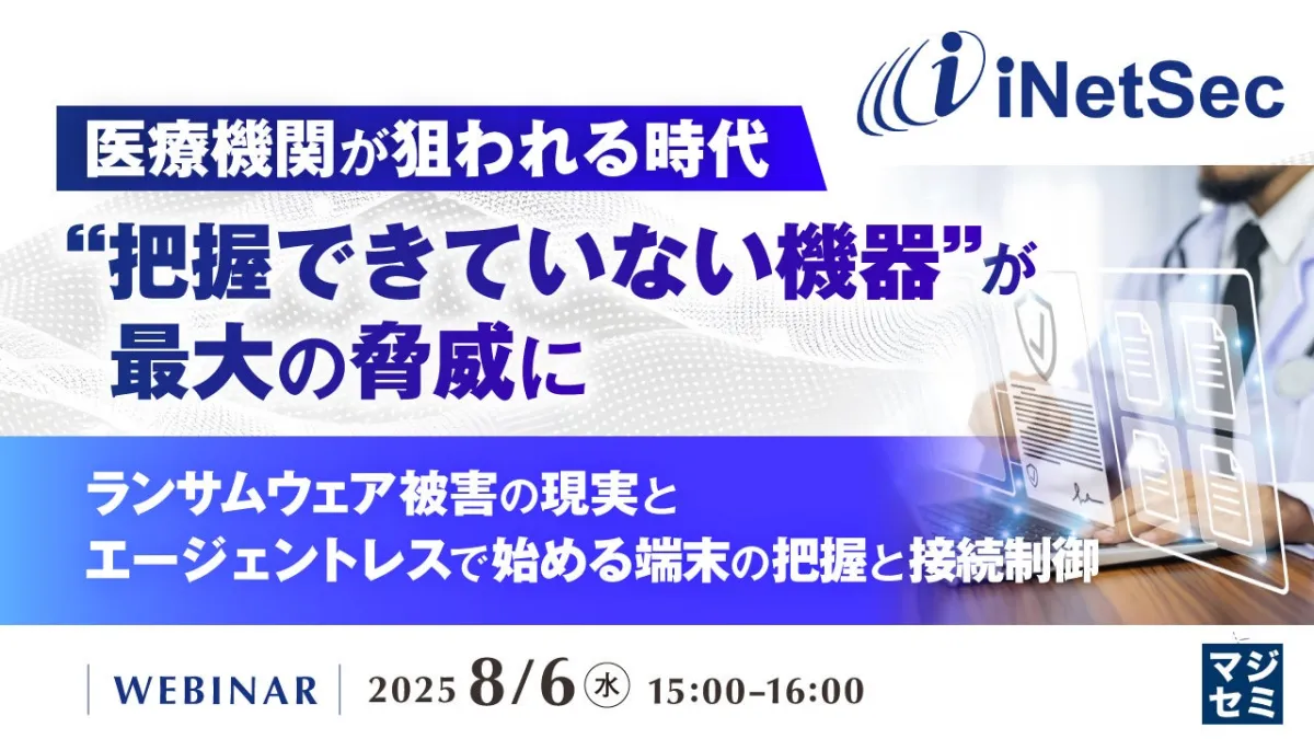 そこで、マジセミ株式会社は医療機関のセキュリティ対策というテーマでウェビナーを開催します。このセミナーでは、「端末・ネットワーク機器の把握と制御」に焦点をあて、実践的なアプローチを提供します。具体的には、エージェントレスのソリューションであるiNetSec SFを用い、ネットワークに接続されている全端末を自動的に検出する方法を紹介します。この技術は、未許可の端末を遮断することができるため、形骸化した管理が改善され、実効性のある対策がすぐに実施可能です。さらに、異常通信を検知する能力もあるため、早期のランサムウェア対策にも貢献します。