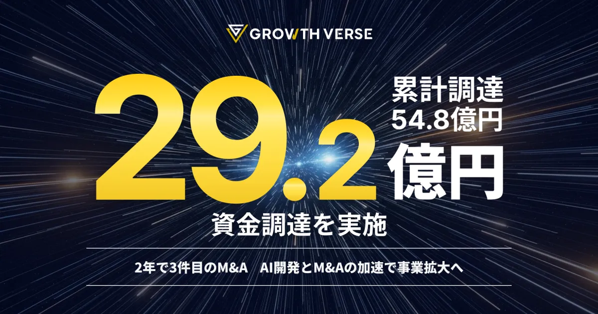 株式会社GROWTH VERSE(東京都港区)は、シリーズCラウンドで9.2億円を、新たにみずほ銀行からの借入20億円と合わせて、総額29.2億円の資金を調達したと発表しました。この調達によって、累計の資金調達額は54.8億円に達しました。