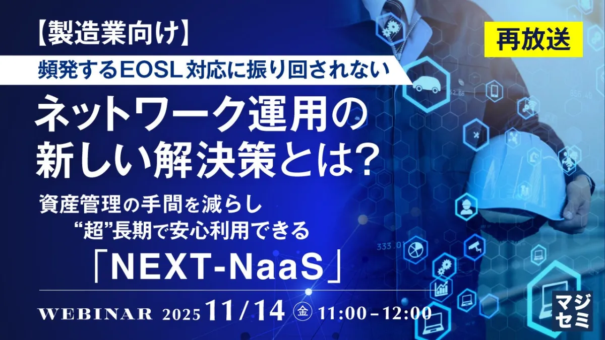 このたび開催されるウェビナーでは、ネットワンネクストが提供する新しいサブスクリプション型サービス「NEXT-NaaS」の詳細をお伝えします。このサービスは、L2/L3スイッチ、ルータ、無線アクセスポイントなどのネットワーク機能を提供するもので、長期的な利用が可能です。これにより、資産管理や廃棄処理の手間を大幅に軽減し、製造業における情シスや総務部門の抱える課題に対する解決策を提供します。