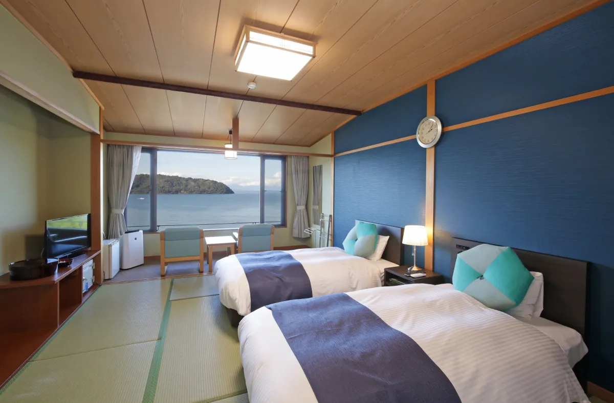 旅館の部屋は和室ツインとなっており、ゆったりくつろぎながら湖のパノラマを堪能できます。