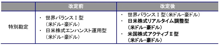 今般の改定では、新たに「日米株式リアルタイム調整型(米ドル・豪ドル)」と「米国株式アクティブⅡ型(米ドル・豪ドル)」の2種類の特別勘定が追加されます。このことにより、異なる運用方針を持つ選択肢が増え、より幅広いリスク許容度に対応できるとされています。また、既存の「日米株式エンハンスト運用型(米ドル・豪ドル)」の新規取扱は停止され、運用関係費が引き下げられます。